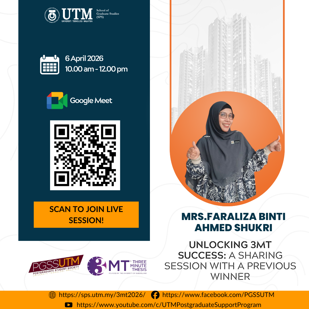Preparing for the Three Minute Thesis (3MT) competition can be challenging. It requires you to present complex research in a clear, engaging, and memorable way within a very limited time. Through this session, you will gain useful insights and practical tips to help you strengthen your presentation and communicate your research more effectively.