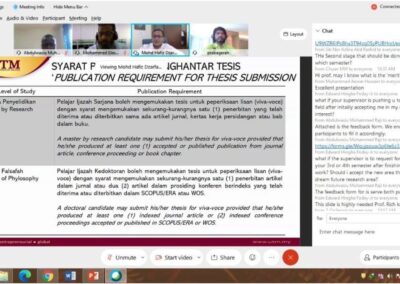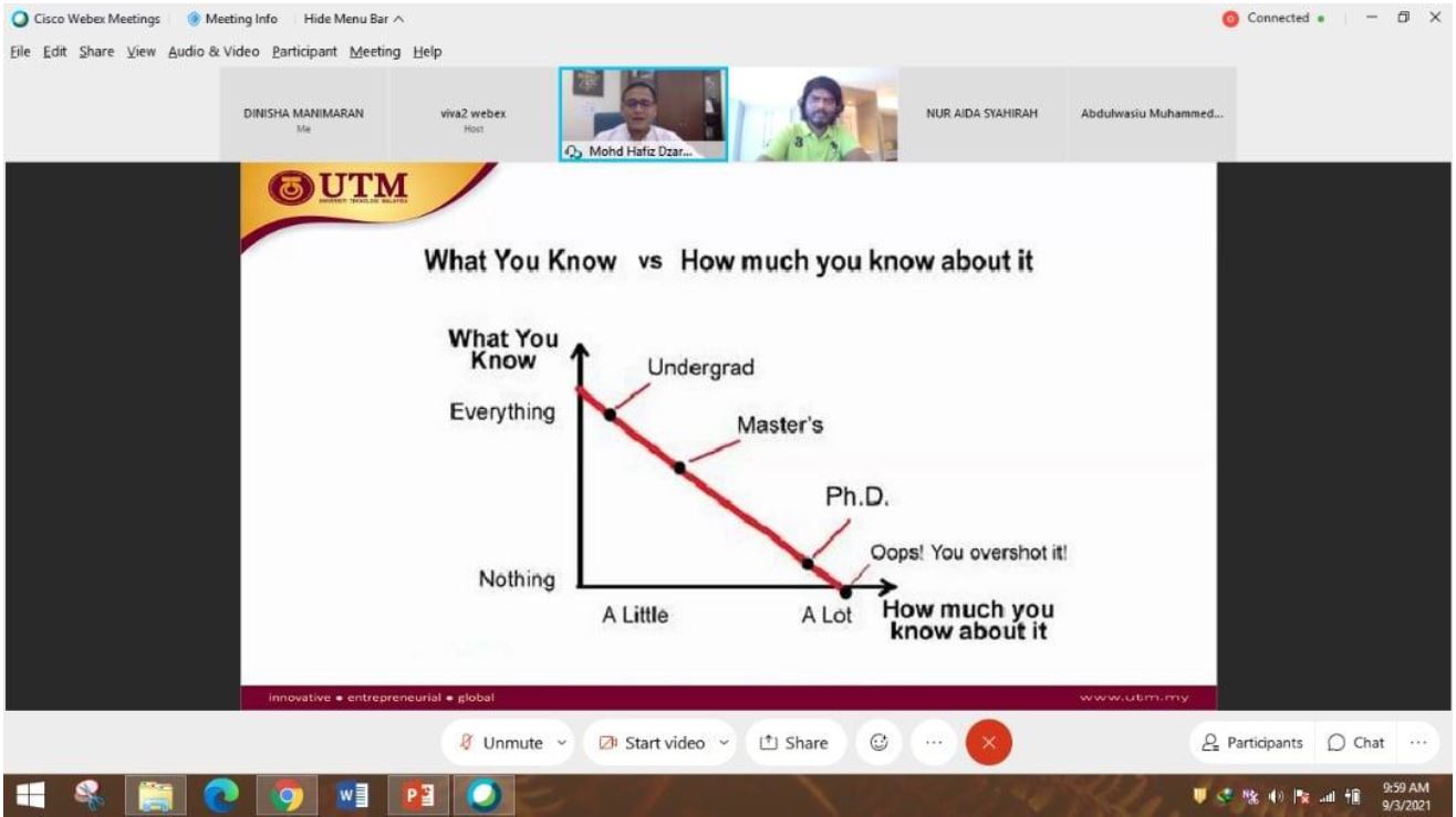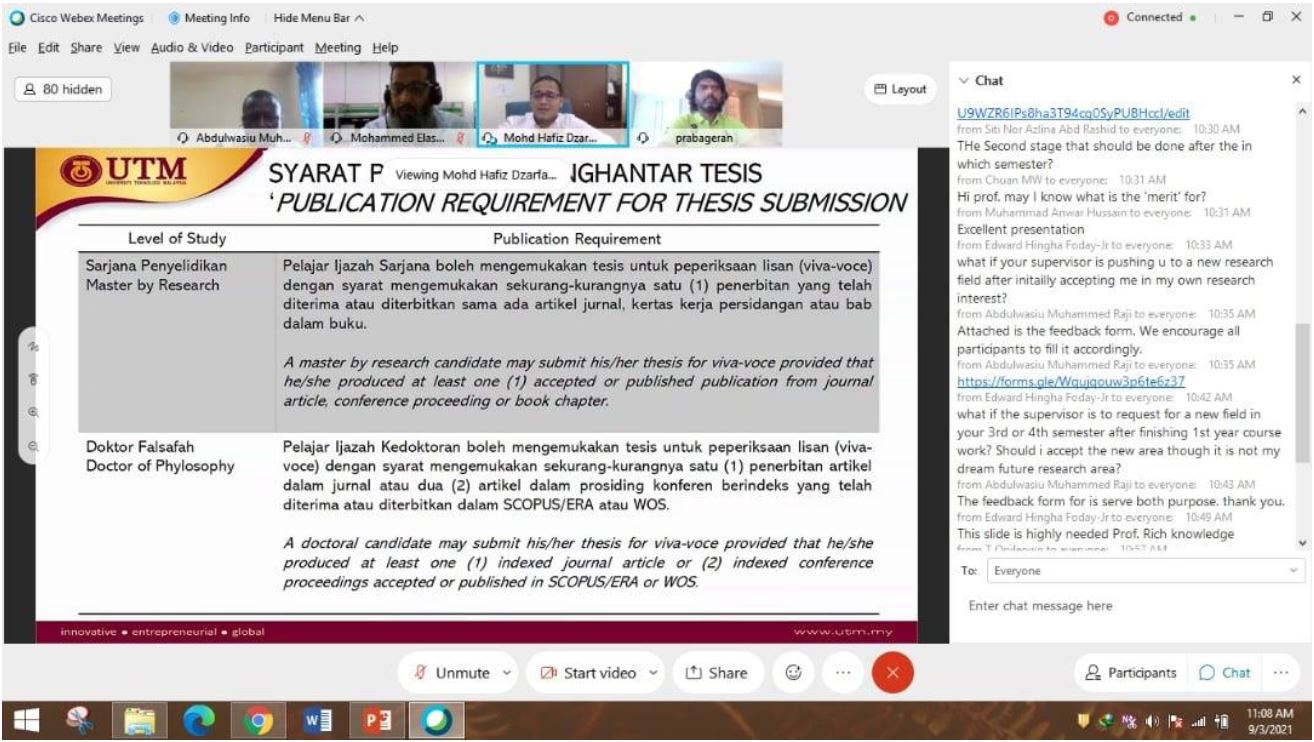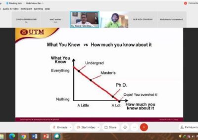 The aim of this workshop is to share useful tips with new postgraduate students on how to survive the postgraduate study. Besides, this program also gives an insight to dear freshies on how to juggle between study and personal life as some of candidates are still working while pursuing their Master/PhD study. The outcome of this program is to provide full support and motivations to the students, encourage them to give the best in their study and eventually shape them to become an outstanding Master/PhD student as product of UTM. The feedbacks provided by the participants for this event was truly satisfying and all of them are positive comments. This program has successfully gives a significant impact to all participants as they really enjoy the session. Speaker shared his own experiences as a postgraduate student from the very beginning until the end of the study. The audience was truly amazed with his strong determination in completing his PhD in Imperial College London, UK, despite the unforeseen obstacles encountered during his study. Furthermore, speaker also shared his personal statistics of the main goal for postgraduate students pursuing their postgraduate study. The outcome shows more than 50% of the graduates pursued their PhD study for the sake of chasing the “Dr.” title. It was mind blowing and interesting “bitter” truth to be shared with the new postgraduate students.